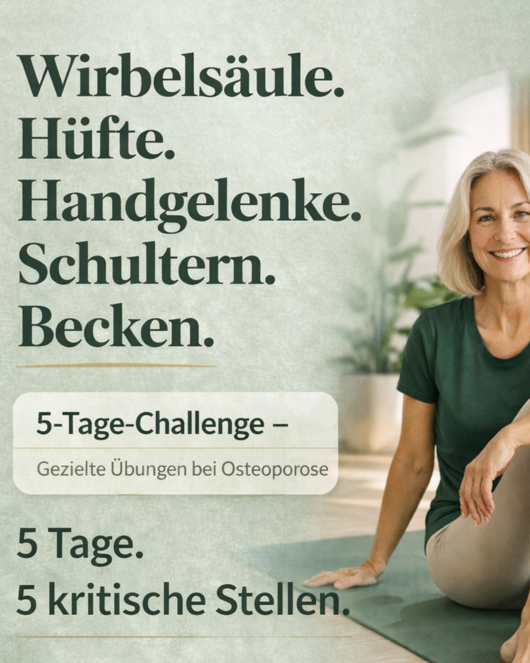 Die Übungen sind bewusst so aufgebaut, dass sie auch bei bestehender Osteoporose sanft und sicher ausgeführt werden können.